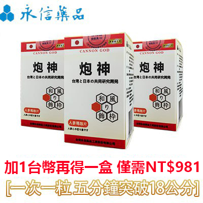 半小時前【活動最後1天!可免費領取一瓶!】只需一粒,效果立現--- 脱胎换茎,强悍重生!永信藥業攜手アステラス製藥株式會共同合製 “炮神”登場 衛福部核可服用、全球男人瘋搶!僅需一粒助你壯碩無比,兇猛异常,即刻生效、保你性福一生! 完美解決所有性功能障礙,輕鬆“硬”對自如,藥勁猛烈 - 共3瓶 【加1台幣再得1盒】二盒+試用裝一瓶【限量50组】【炮神】,僅需 NT$981 --- 一次一粒,五分鐘突破18公分!